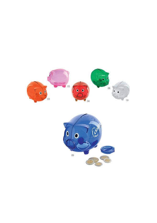 Alcancía de plástico, en colores traslúcidos en forma de cerdito con tapón tipo rosca en la parte inferior.