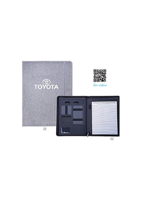 Carpeta multiusos con exterior en tela, cierre y compartimento externo para guar-dar tablet o documentos. Cuenta con block de notas tamaño carta de 20 hojas rayadas, compartimento interior para tablet, 2 soportes ajustables con velcro para sujetar tablets y celulares, cinta elástica para Smartphone, cinta elástica para me-morias USB u otros accesorios, compartimento con ventana plástica para creden-ciales, divisiones para tarjetas, bolsa de malla, así como cinta elástica para fijar bolígrafo, el cual no viene incluido.