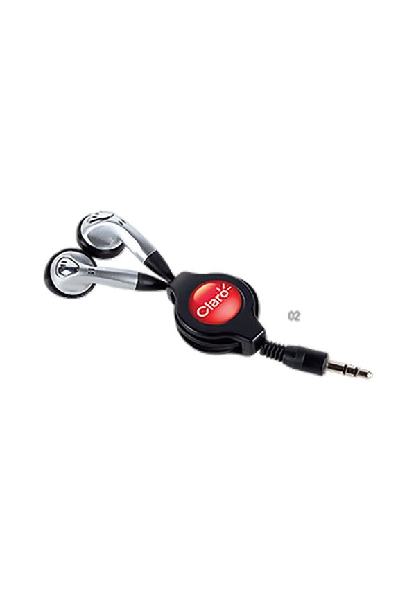 Audífonos personales. Para guardarse, se enrollan alrededor de la polea de plástico gracias a su mecanismo retráctil. El seguro se activa estirando el cable al tope. Extensión total 79 cm.