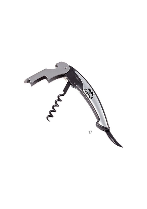 Herramienta multifuncional con navaja den-tada plegable, destapador de acero inoxi-dable y sacacorchos. Presentación: caja en color blanco.
