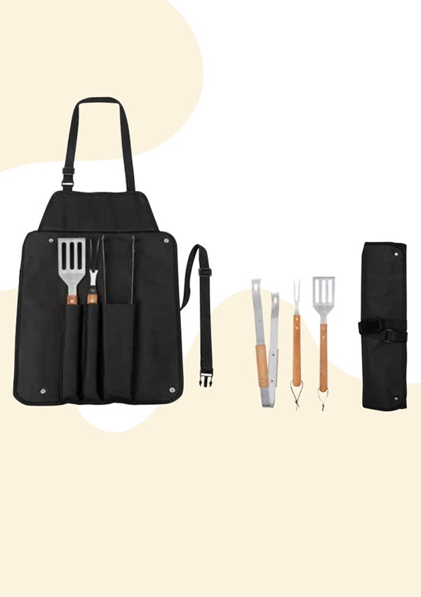 Set de BBQ en delantal. Incluye espátula, pinzas y tenedor