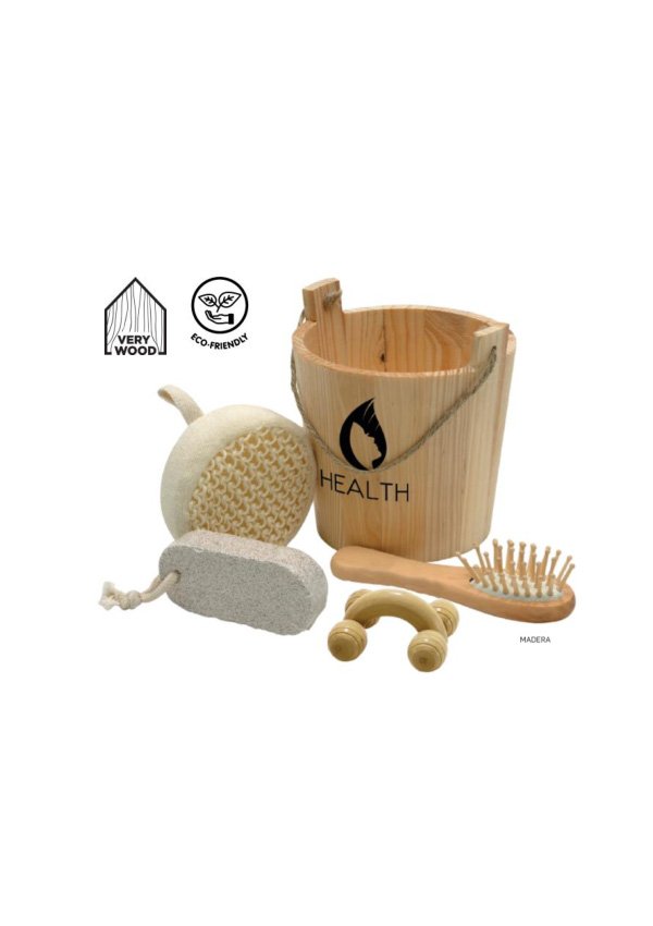 Set de cubeta de madera, esponja, piedra/lima, masajeador y cepillo pequeño de cabello.