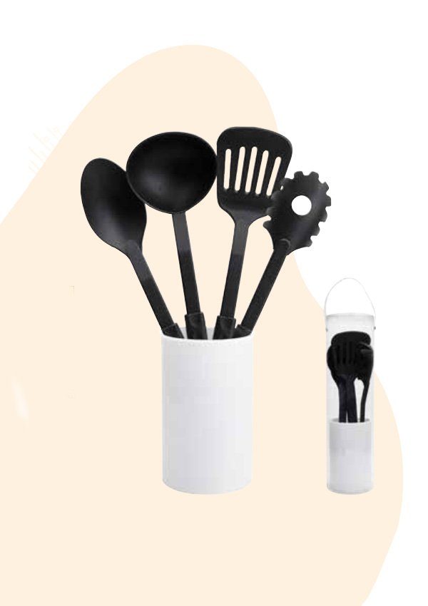 Incluye base y 4 utensilios de cocina: cuchara, cucharón,